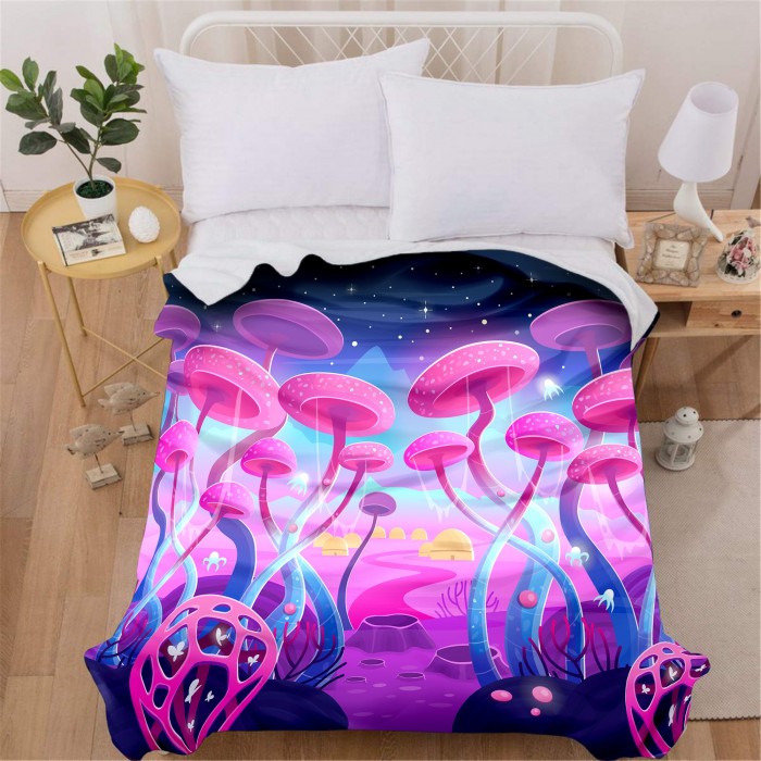 Our Sherpa Blankets are woven from the highest quality materials. We guarantee satisfaction or your money back. The Mushroom Planet Blanket features a fantasy planet dominated by gorgeous mushrooms.